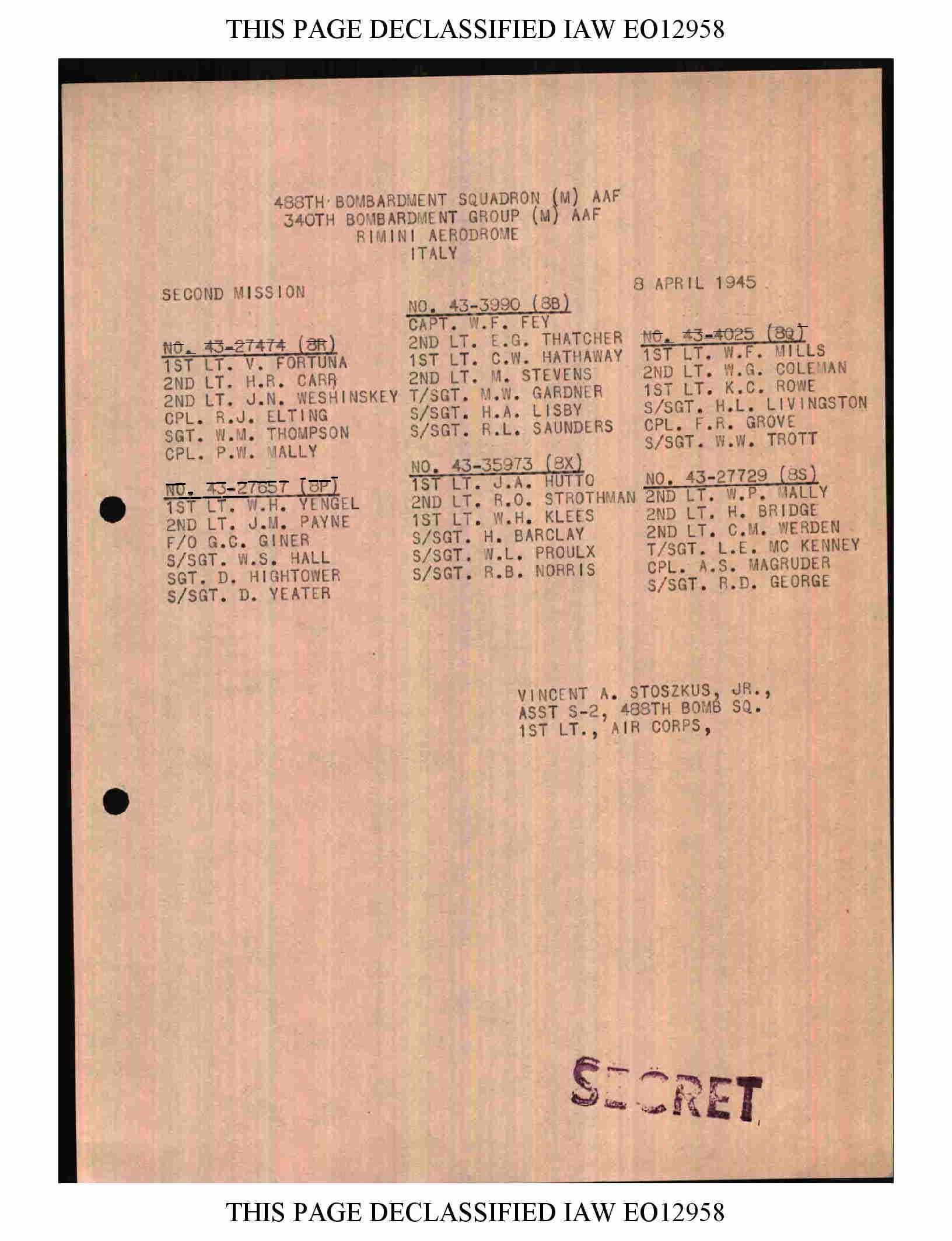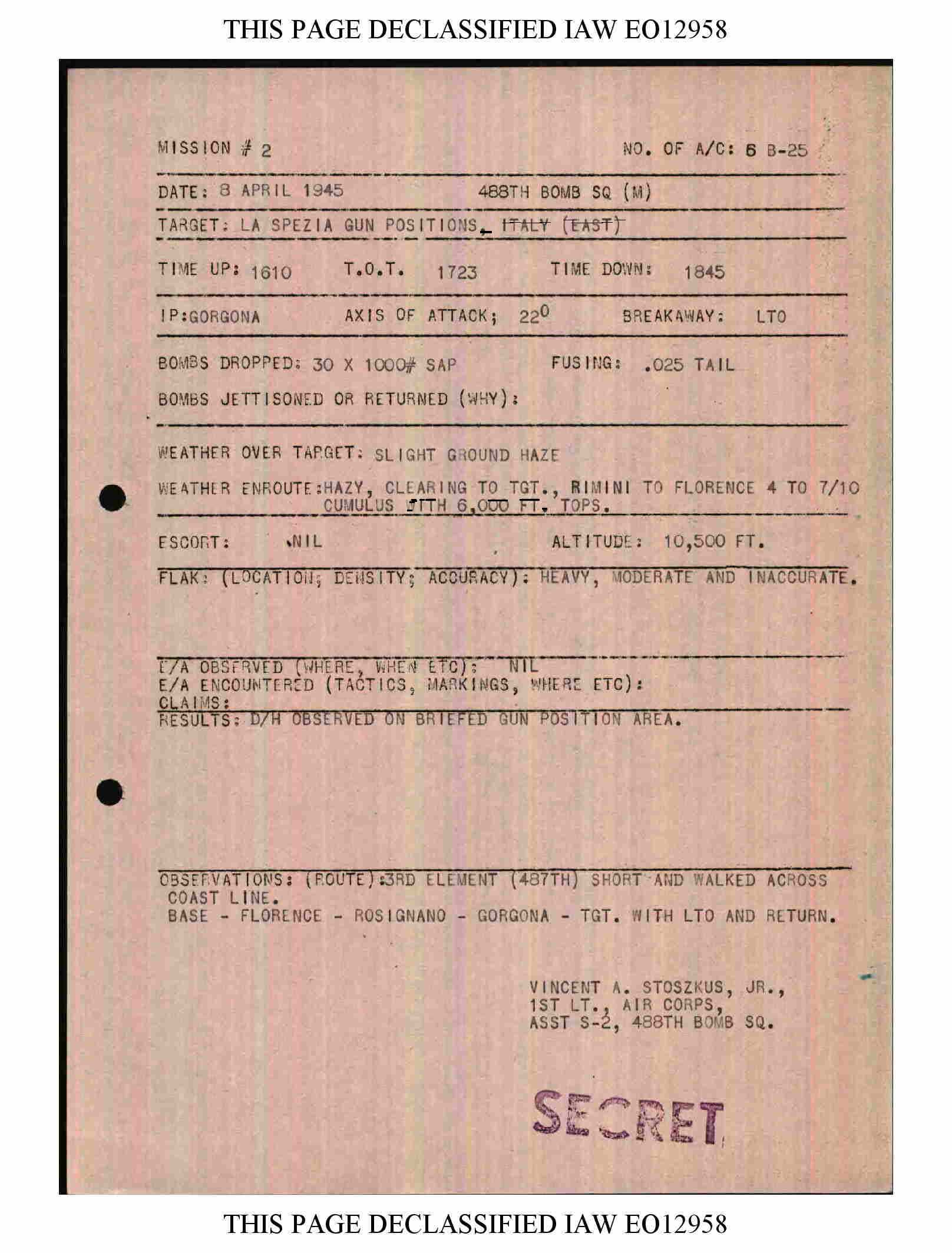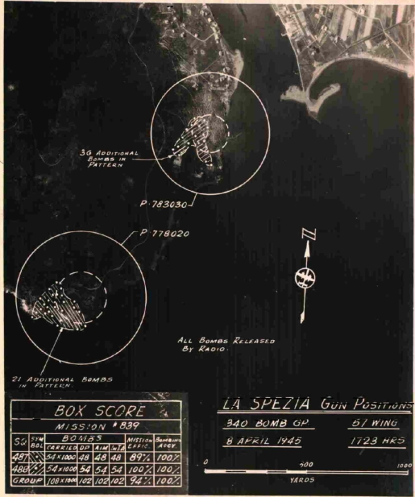 | 487th | La Spezia Coastal Defense Guns - 9 Ships. Pattern hit left side of gun positions. Inaccurate flak was encountered. |