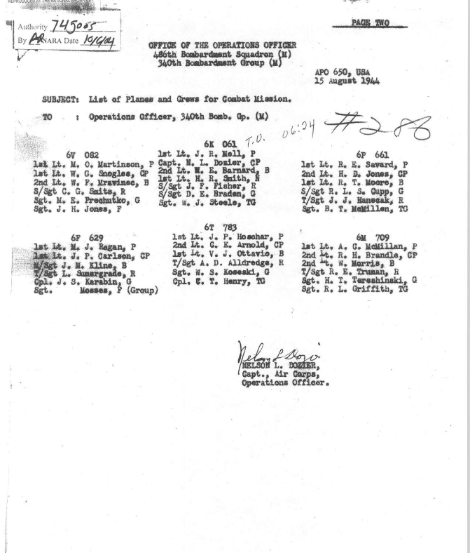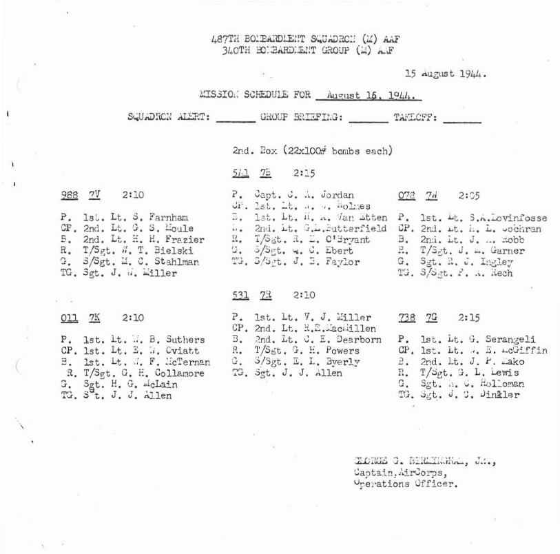 | 486th | The Group sent 72 ships into the air and over the S France coast by 0730 this morning. Very few boxes dropped their bombs because of the damned weather which blanketed the coast. This was very disappointing, however, because little or no flak was observed; everyone returned safely and grateful for that at least. In the afternoon bridges at Avignon were selected as targets. This indicated the B-25s could be taken off ground support work and put back on semi-strategic work. A French Major General and his aide-de-cmap accompanied the invasion during the afternoon after being initiated about the Group by Col. Chapman. The mission was rough - three ships did not return and most were holed. Two went down over the target and one over the sea. Our ship, piloted by Lt. Hoschar was struck in the right wing, flew apart and set the ship into a flat spin. No one was seen chuting out but chutes may have been overlooked because of the excited state of the crews due to the intense, and accurate flak. Some are inclined to believe several men may have gotten out safely and this writer is one who believes. On the return trip, pilots J. D. Smith and Morrison spotted a 488th ship going down and when the crew landed in the water they each dropped spare dingies and radioed fixes for air-sea rescue. The squadron was not happy and groups of men could be seen about the area in discussion, quiet and soberly talking about the mission. The Squadron's turn for stand-down will serve tomorrow and so to help forget about the mission. Quite a few boys drained their sorrow with some beer and whiskey - in fact singing could be heard during the small hours. Losses in Action: 1st Lt. J.P. Hoschar 2nd Lt C.E. Arnold 1st Lt. V.J. Ottavio T/Sgt A.D. Alldredge Sgt. W.D. Koseski Cpl. C.T. Henry |