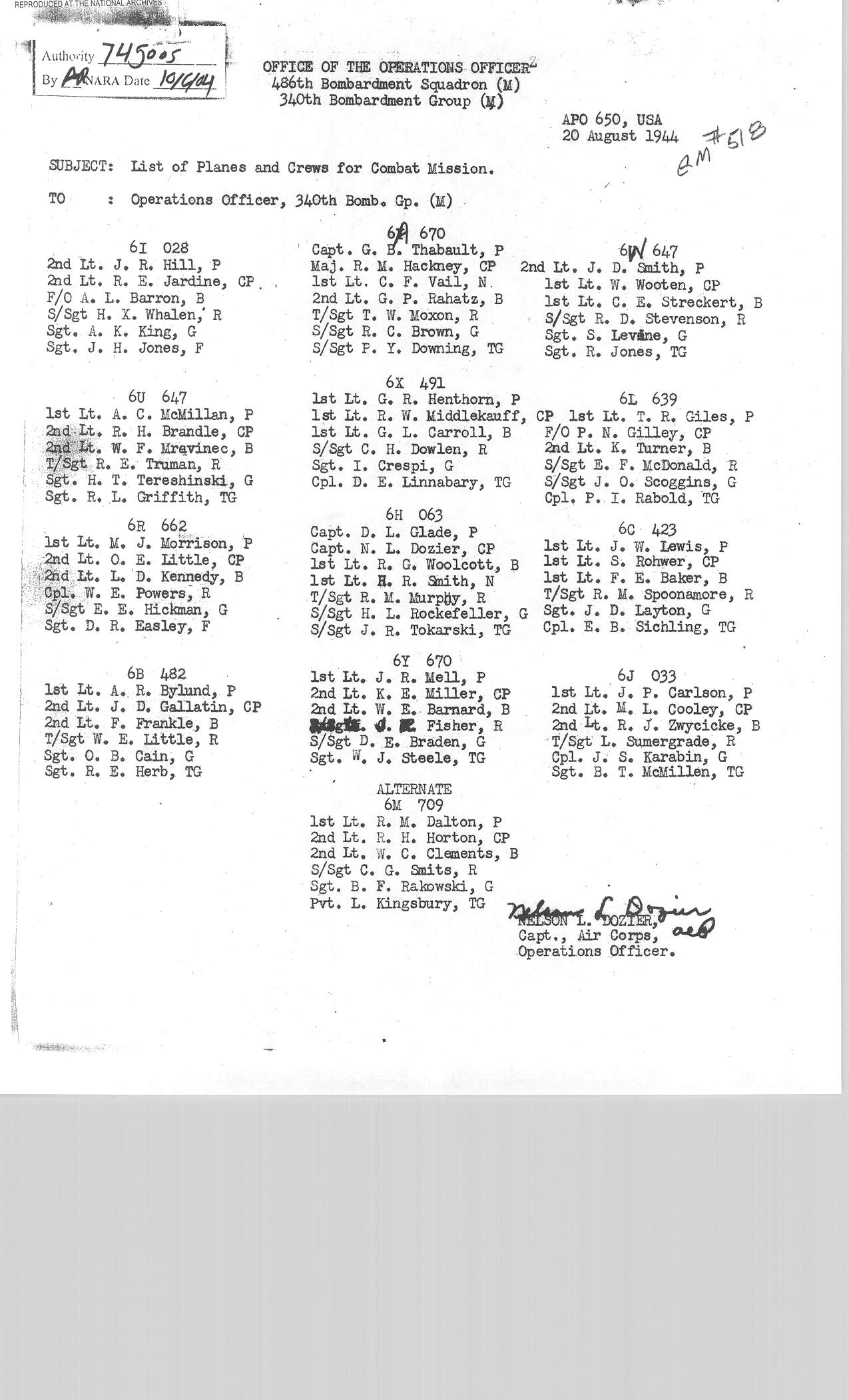 | 486th | Morning mission gave unsatisfactory results - of the 15 enemy ships on the A/D only a few were hit. Of course everyone was disappointed especially Capt. Bridges who was awakened at 0300 to change the bomb load! |