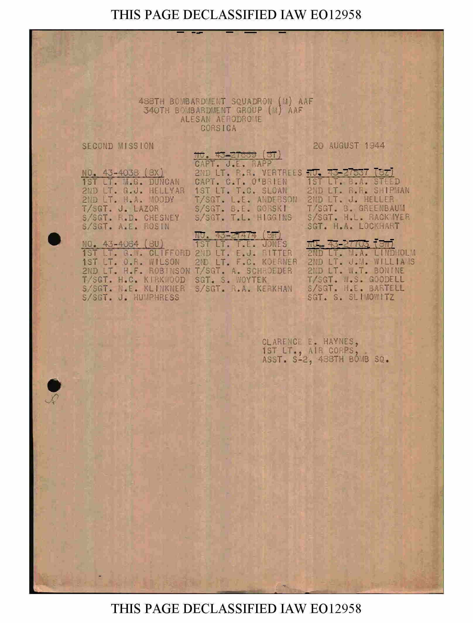 | On the crew list for the 488th Bomb Squadron below, the bombardier in plane 8Z is listed as 2nd Lt. J. Heller. This is Joseph Heller, the author of the novel Catch-22. |