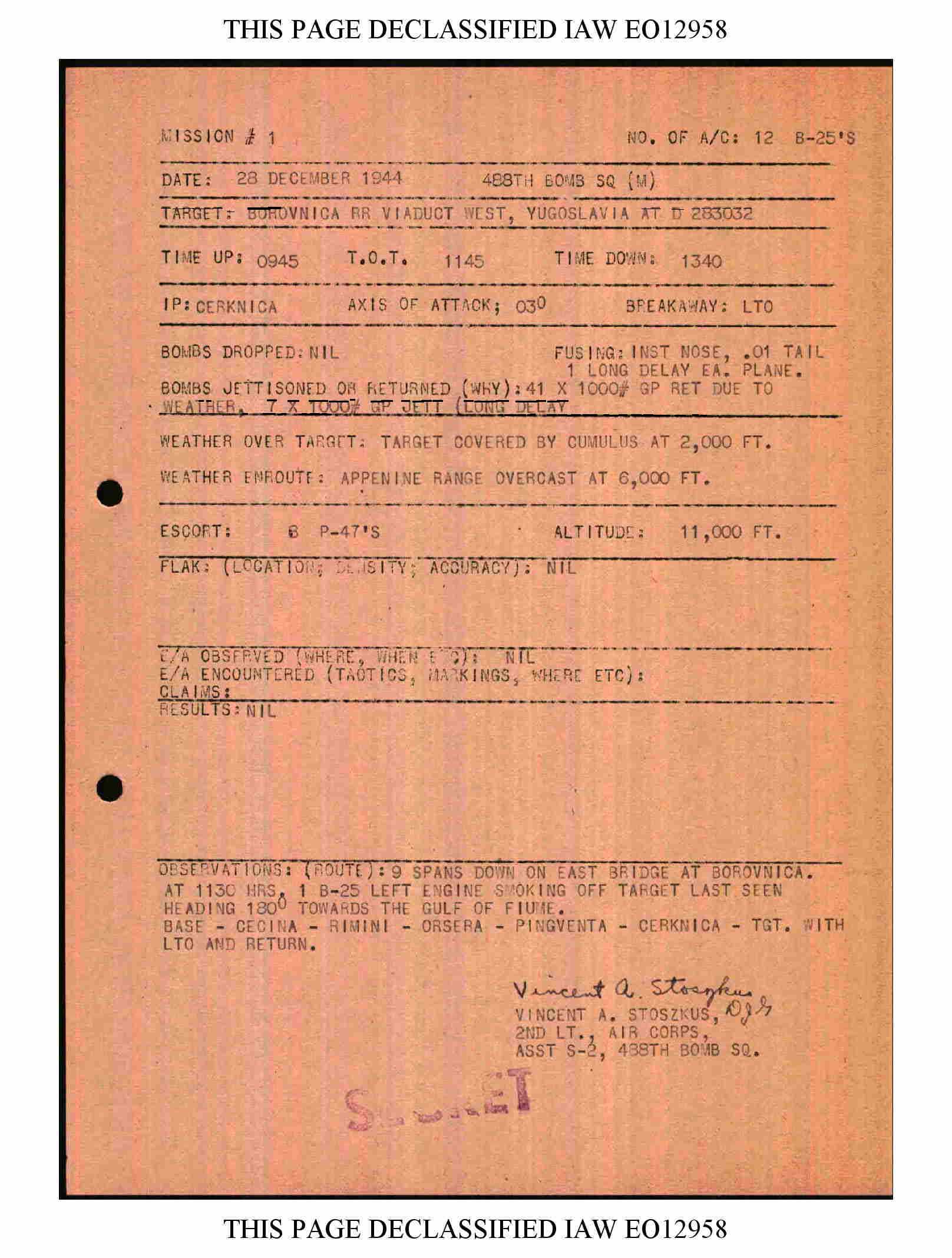 December 28, 1944 Mission to Borovnica E. Railroad Viaduct, Yugoslavia